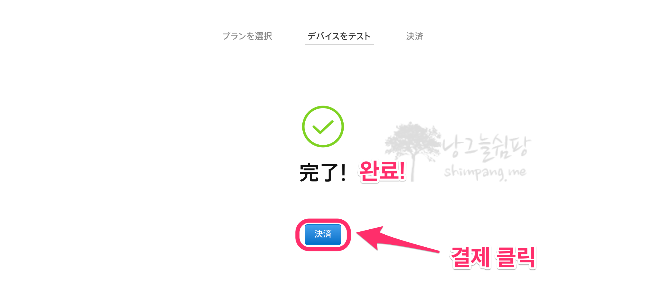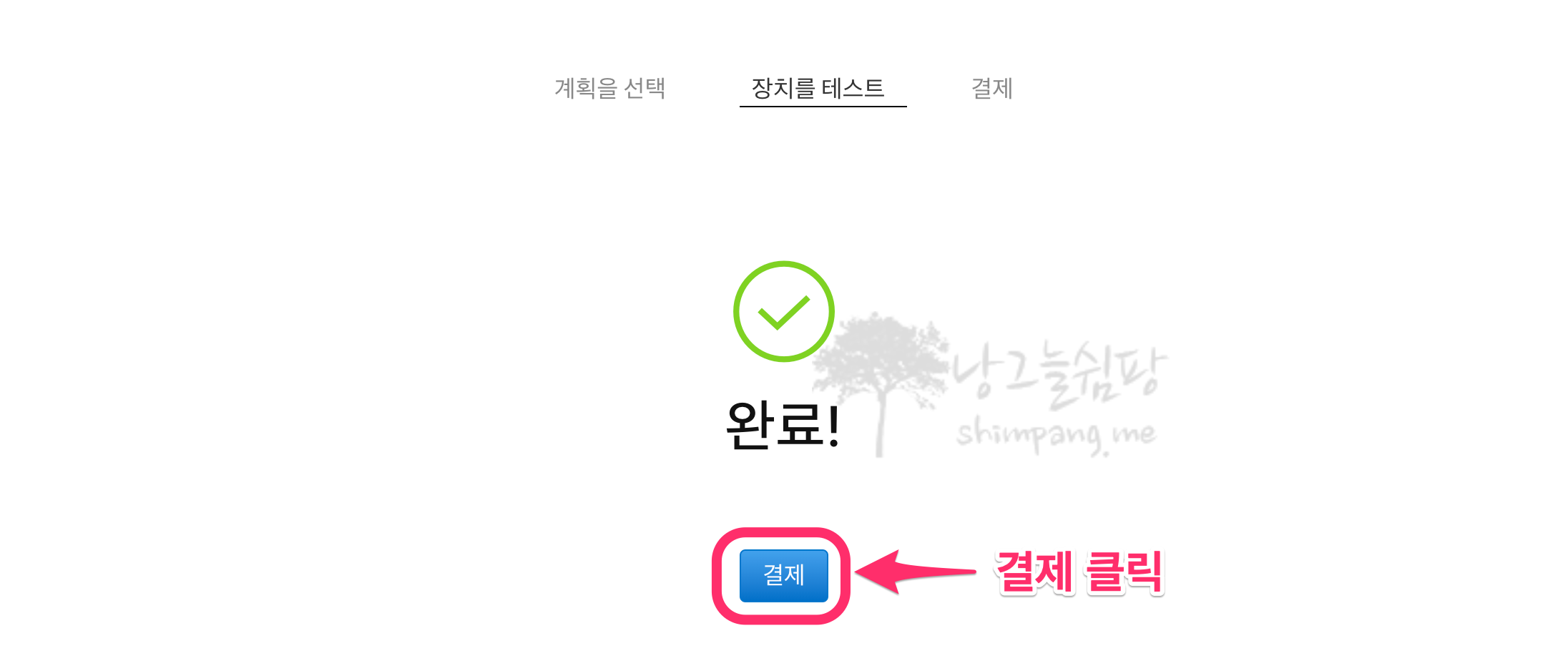 완료 화면이 나오면 파란색으로 되어 있는 [결제] 버튼을 클릭합니다.
