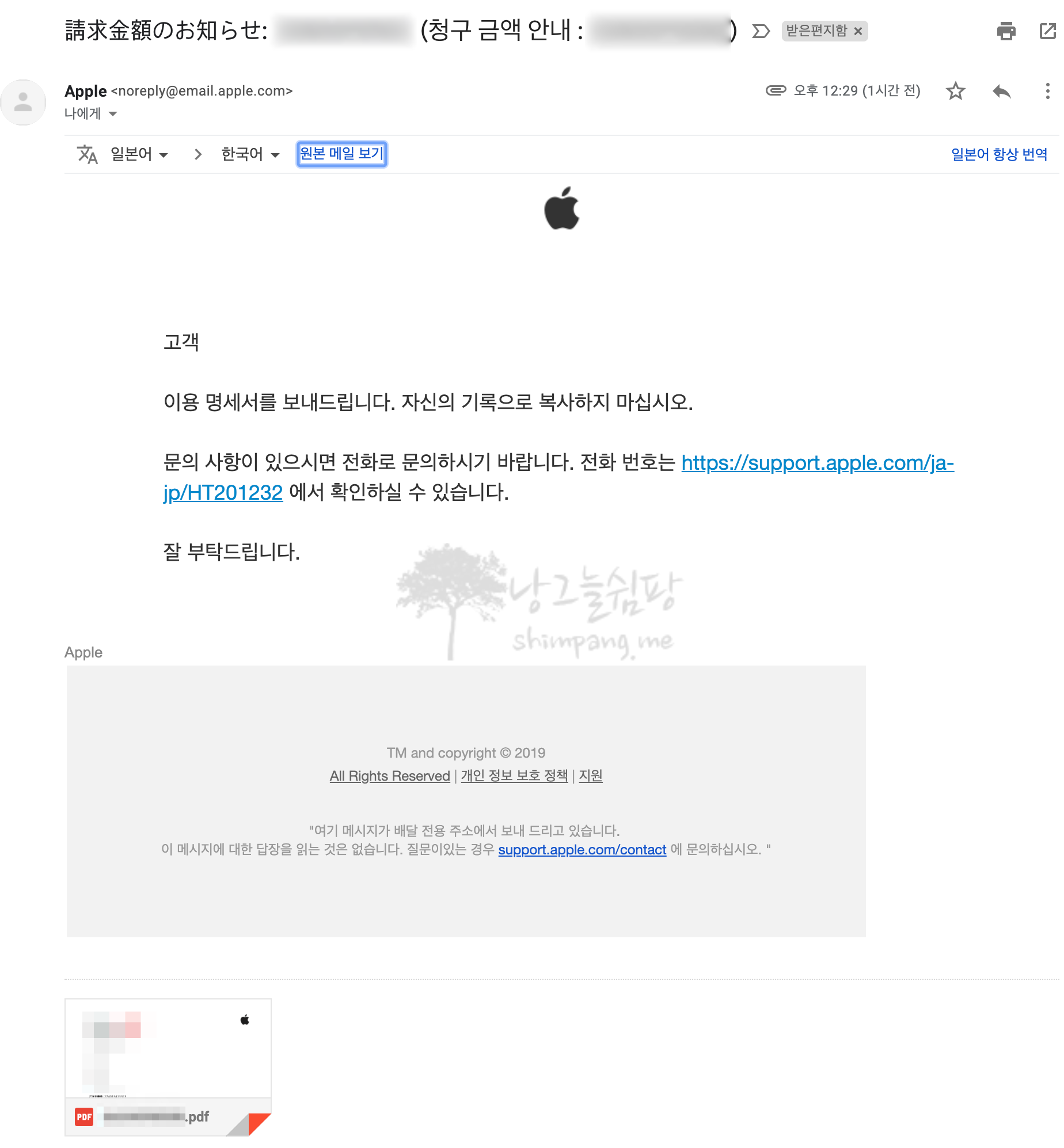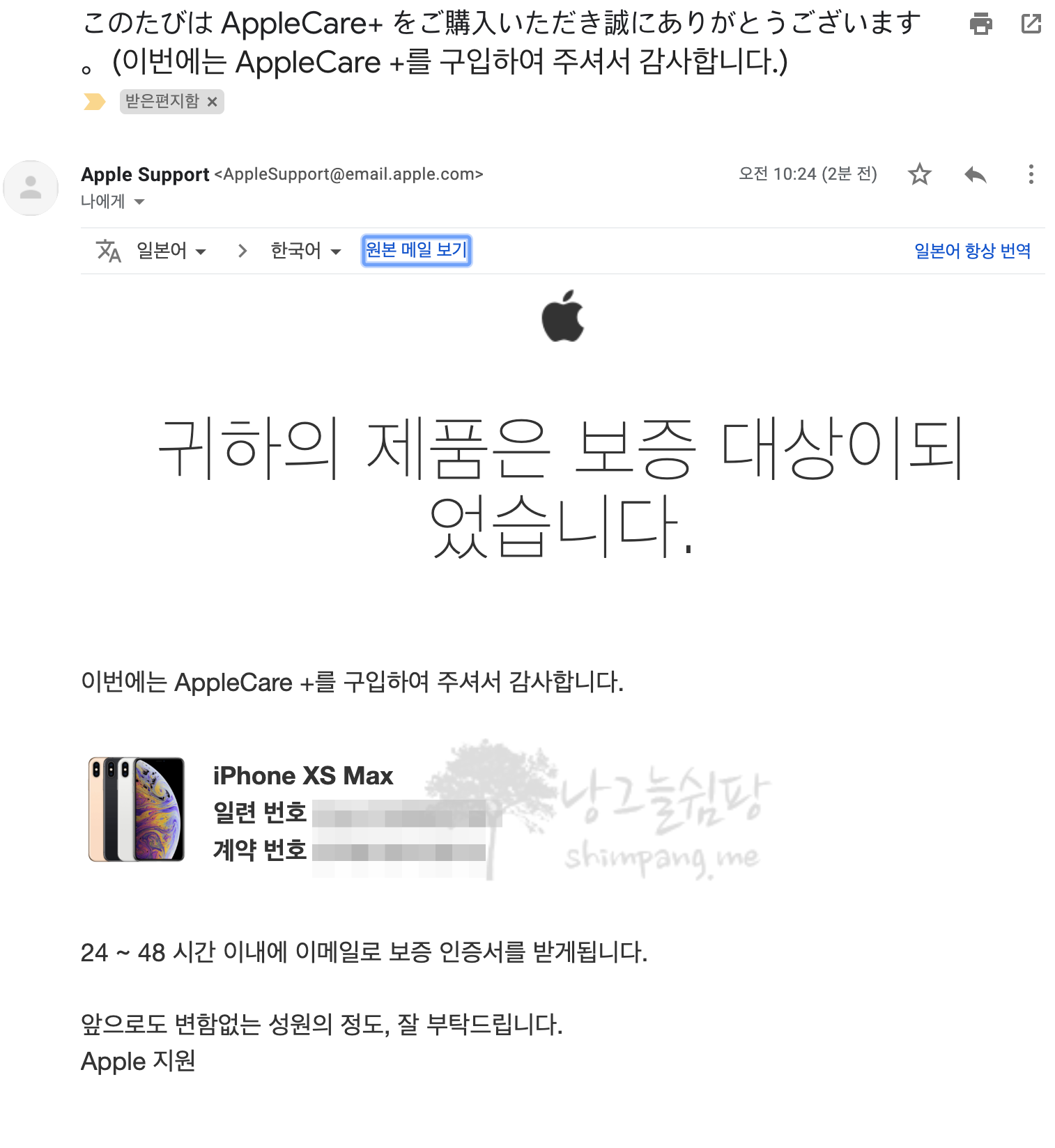AppleCare+ 확정 메일이 일어로 오는데 일어를 모르기에 다시 구글 크롬 번역 찬스를 받았습니다.