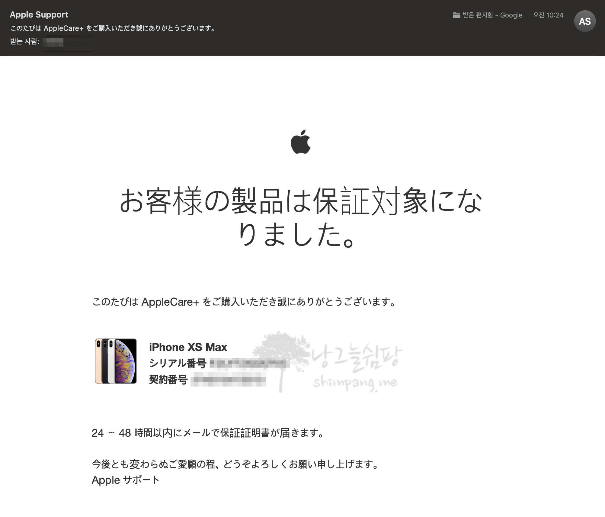 애플케어 플러스 구입 절차가 다 완료된 메일을 오전 10시 24분에 받았고, 보증 확정 안내 메일을 오전 11시 49분에 받았습니다.