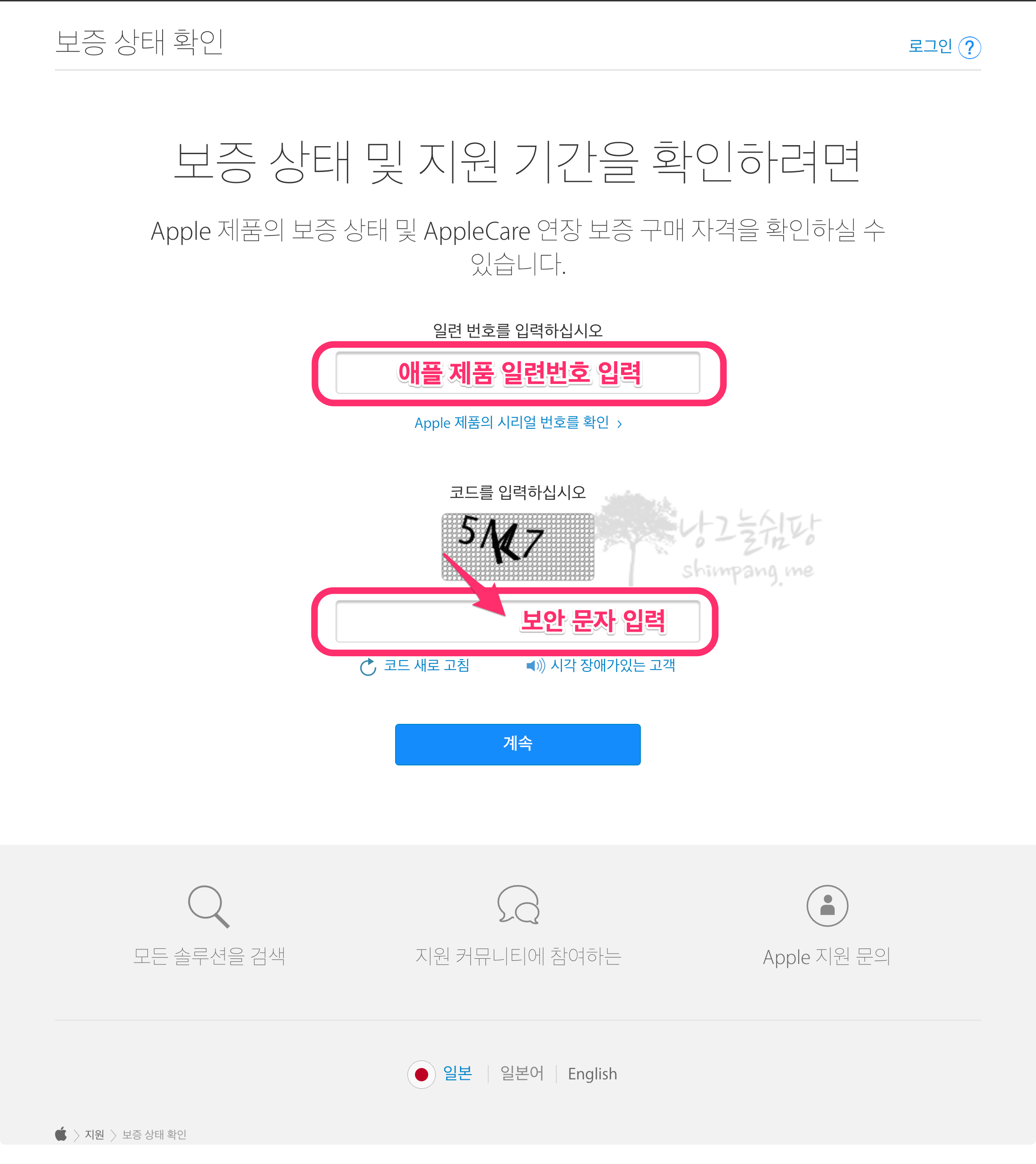 애플 케어 플러스를 적용할 애플 제품의 일련번호를 입력하고, 화면에 보이는 보안 문자를 입력해야 합니다.
