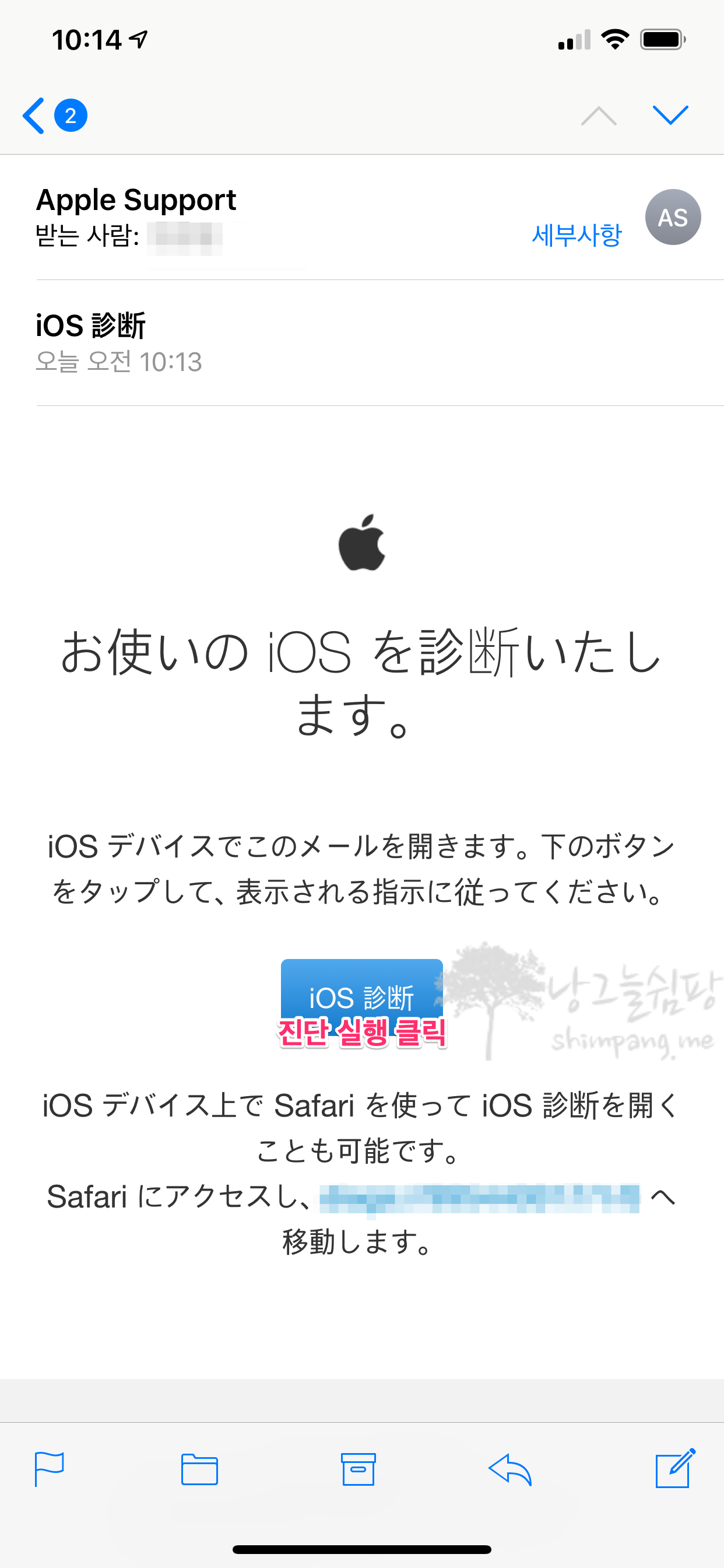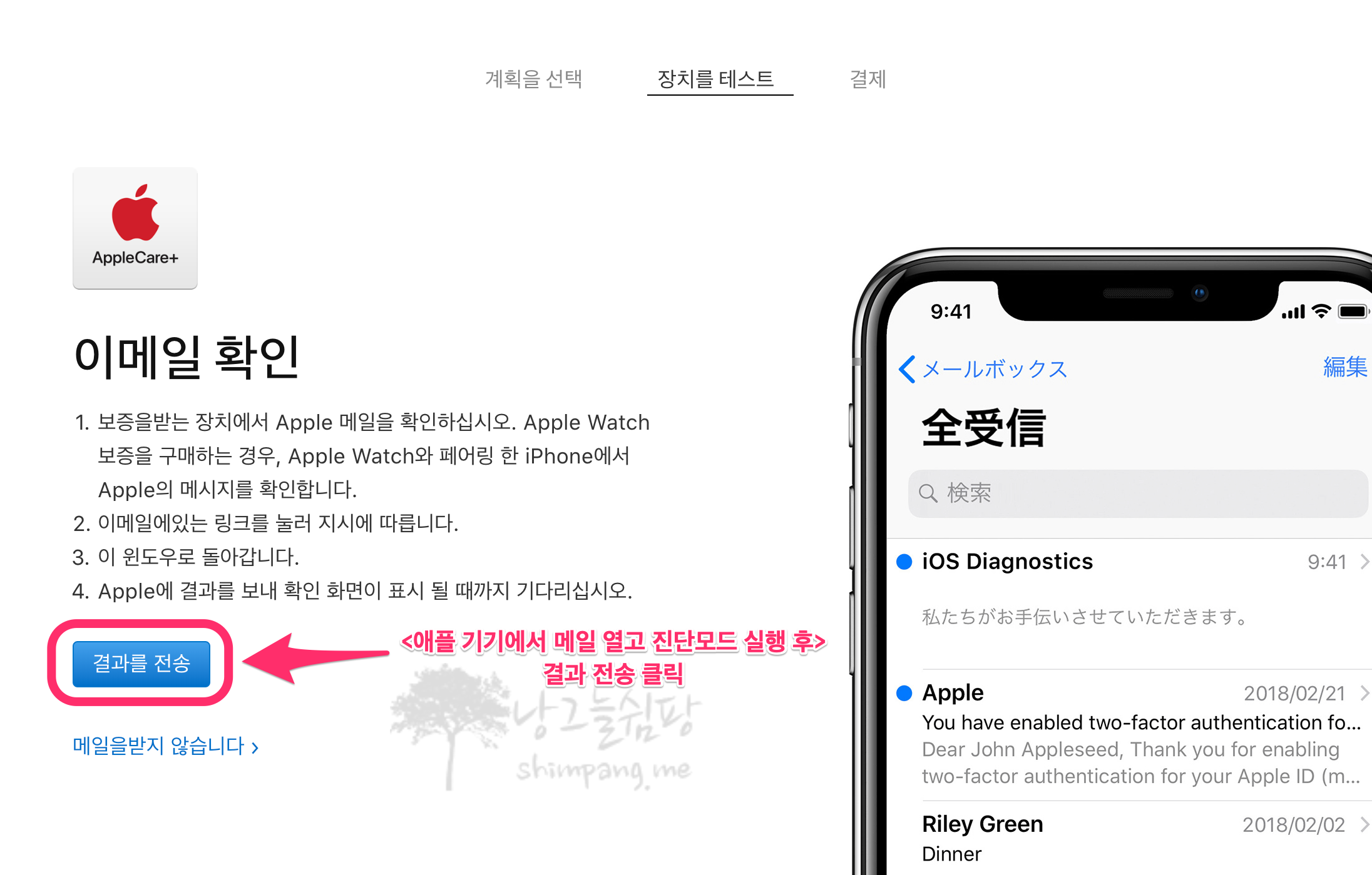 이제 이 화면은 잠시 두고, <애플케어 플러스를 등록할 제품에서 이메일을 열고 진단 절차를 진행>해야 합니다.