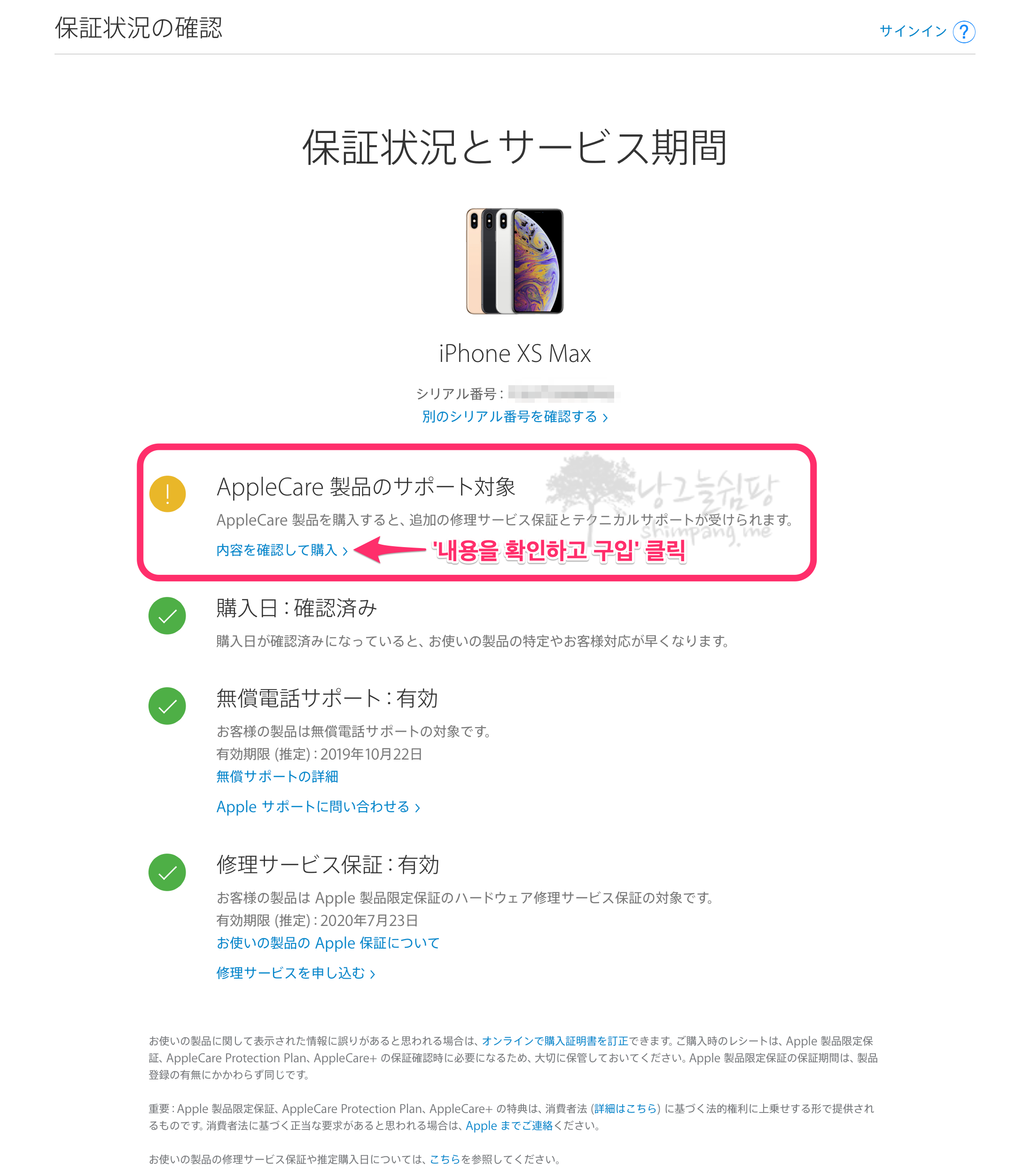 아래 링크의 애플 홈페이지에서 보증이 잘 적용되었는지 조회해봅니다.