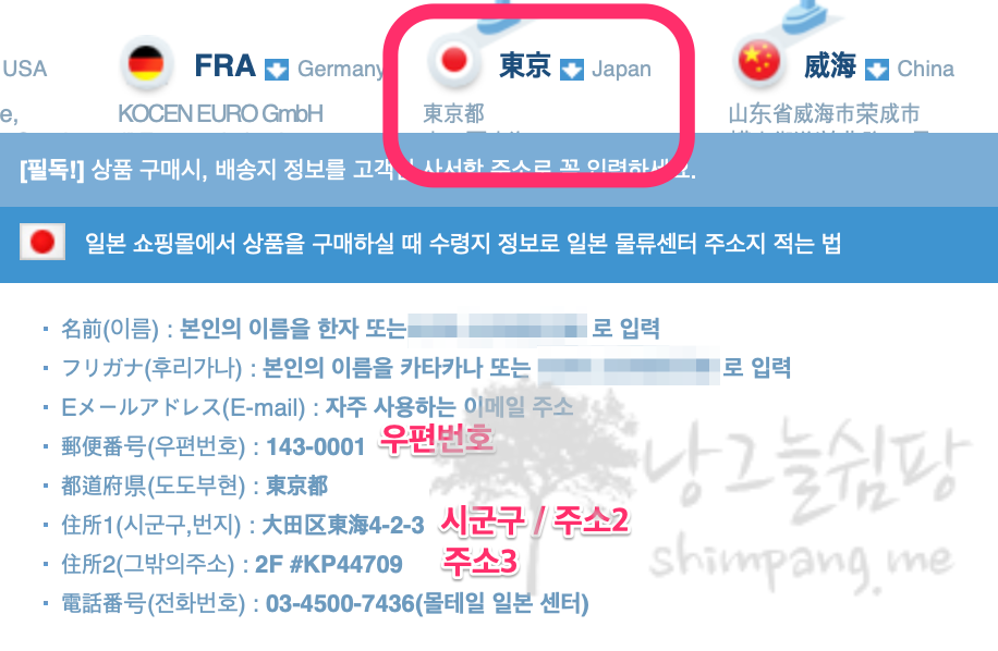 몰테일 사이트의 위쪽에 일본 배대지를 클릭하면 주소가 나옵니다.