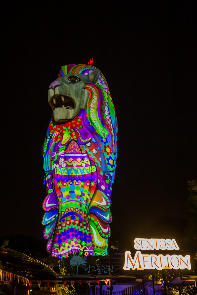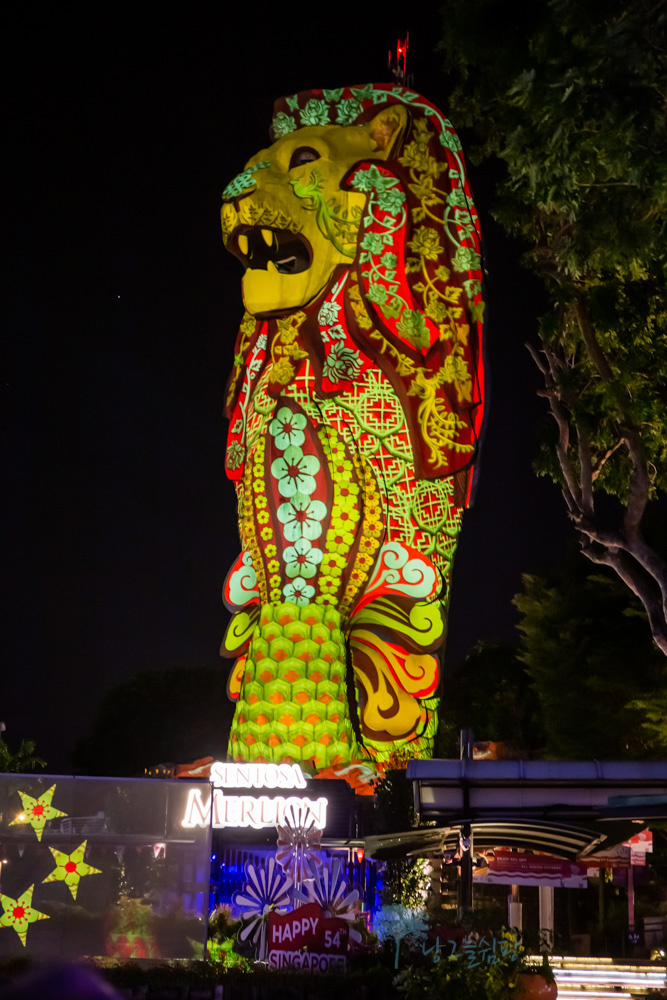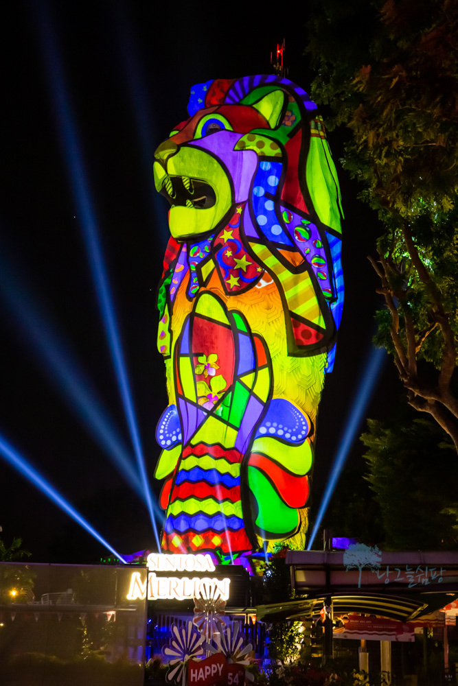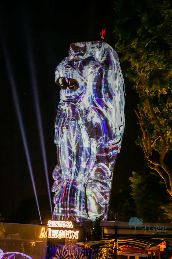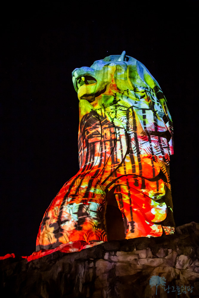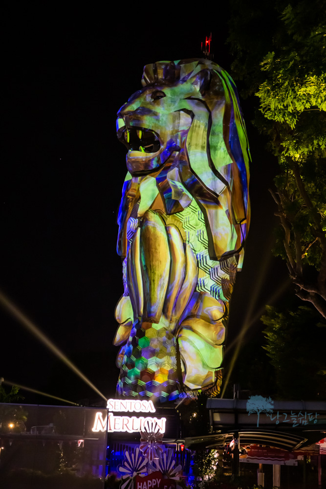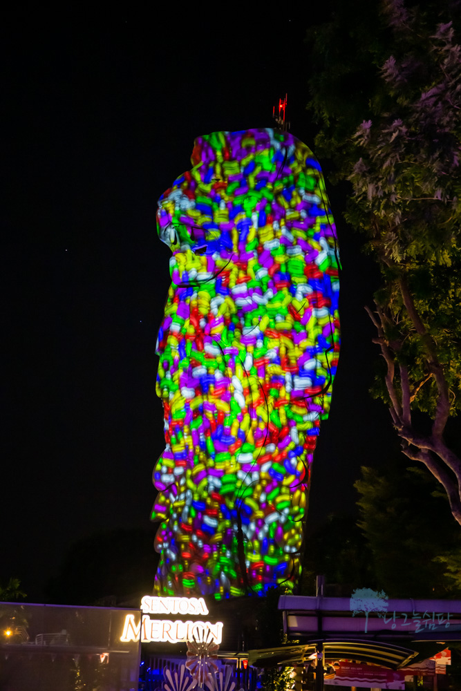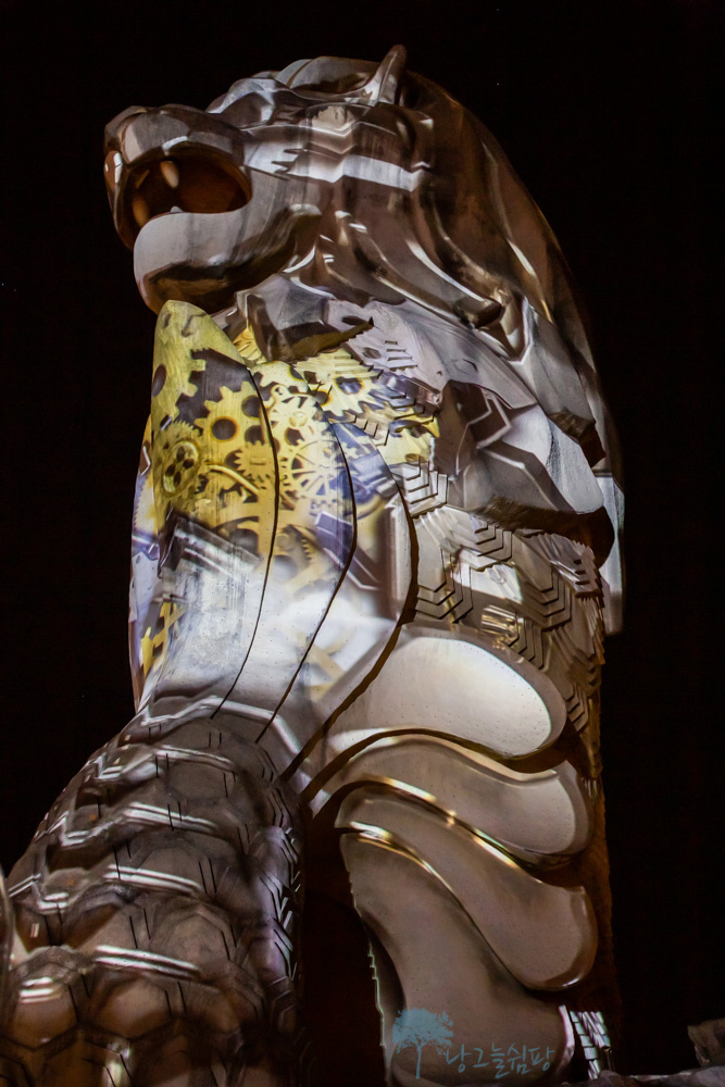 센토사 멀라이언은 밤이 되면 낮에 보이는 모습과는 달리 형형색색의 불빛으로 멀라이언의 모습이 다양하게 변신을 합니다.