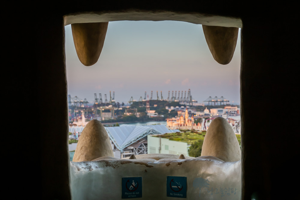 센토사 멀라이언 머리 전망대에서 360도 파노라마 뷰를 마음껏 누리고 입 전망대로 내려가 보았습니다.