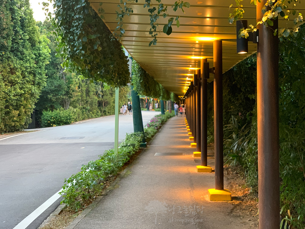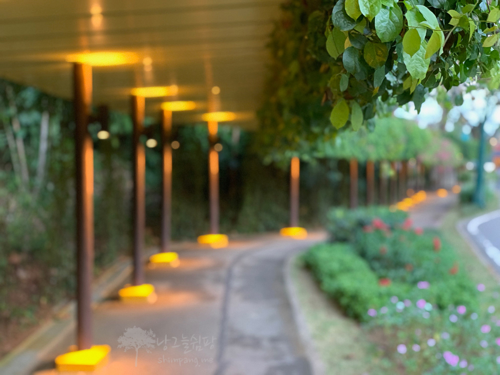 그늘막과 함께 식물이 잘 가꾸어져있는 길에 조명까지 비춰지니 걷기 좋습니다.