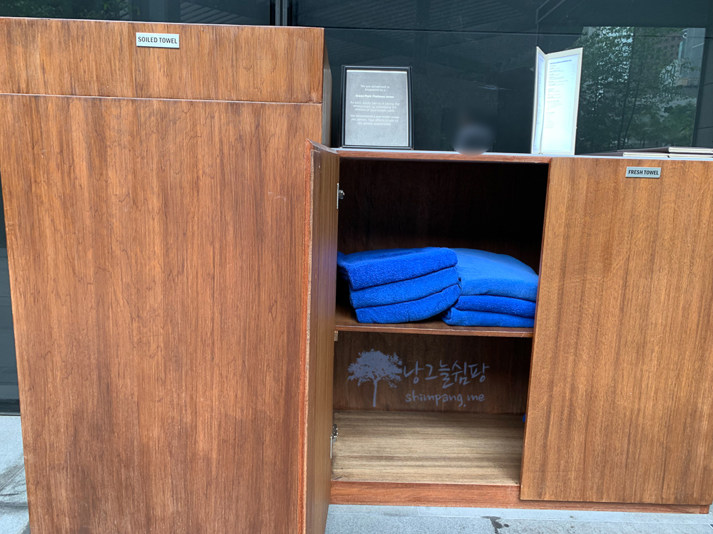 수영장 입구 문을 나서면 오른쪽에 무료로 이용할 수 있는 수영장 전용 수건이 마련되어 있습니다.