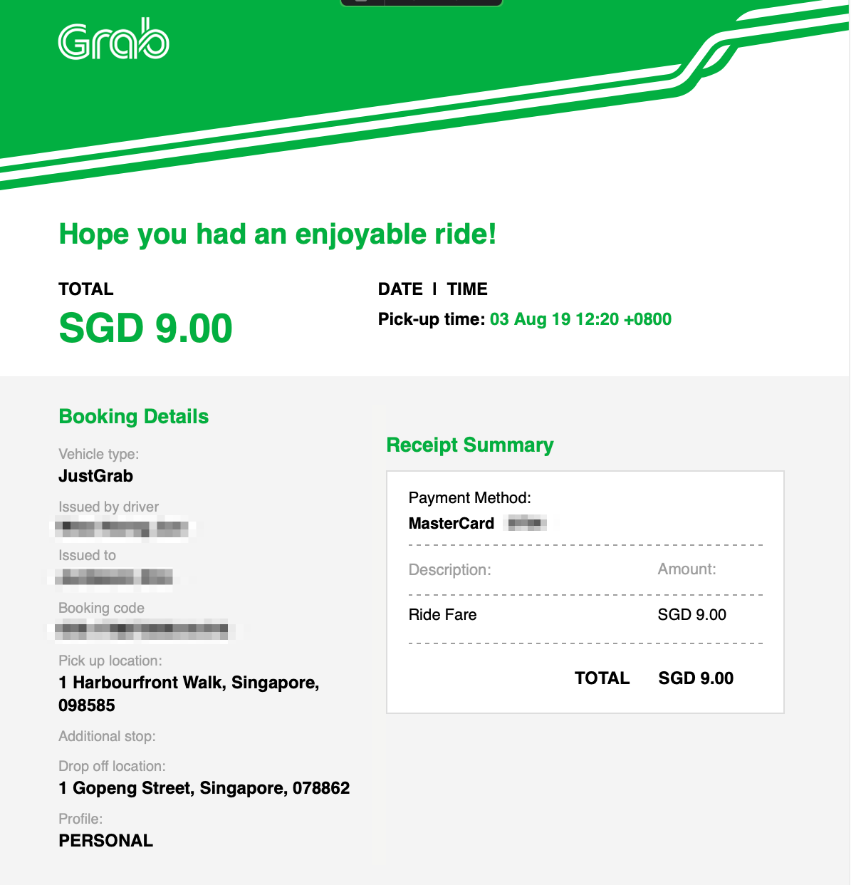2019년 8월 3일 토요일 오후 12시 20분에 하버프론트 Vivo시티에서 싱가포르 칼튼 시티까지 Just Grab 옵션으로 9싱가포르달러(약 7,900원)라는 운임이 나왔습니다.