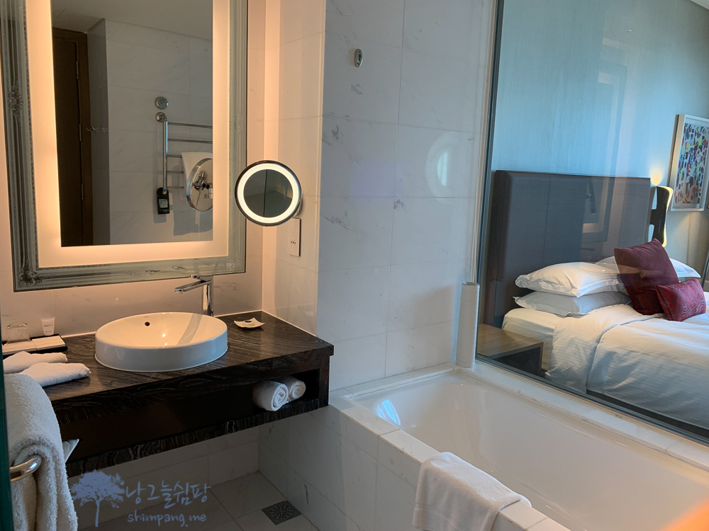 화장실은 통 유리로 오픈 되어 있으며, 욕조에서 블라인드를 내려서 가릴 수 있습니다.