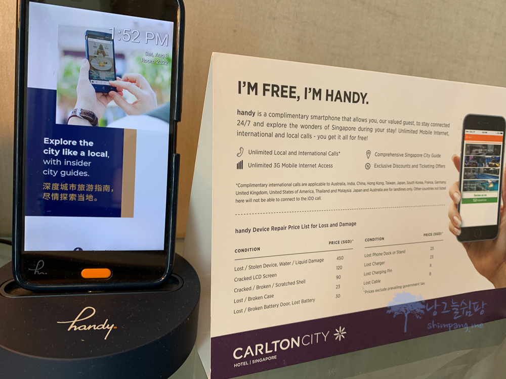 제가 이 매력적인 <핸디>를 사용하지 않은 이유는, 싱가포르 현지 유심이 매우 저렴하고 무엇보다 <핸디>가 고장나거나 분실했을 경우 청구 금액이 커서 호텔 객실에 고이 모셔 두었습니다.